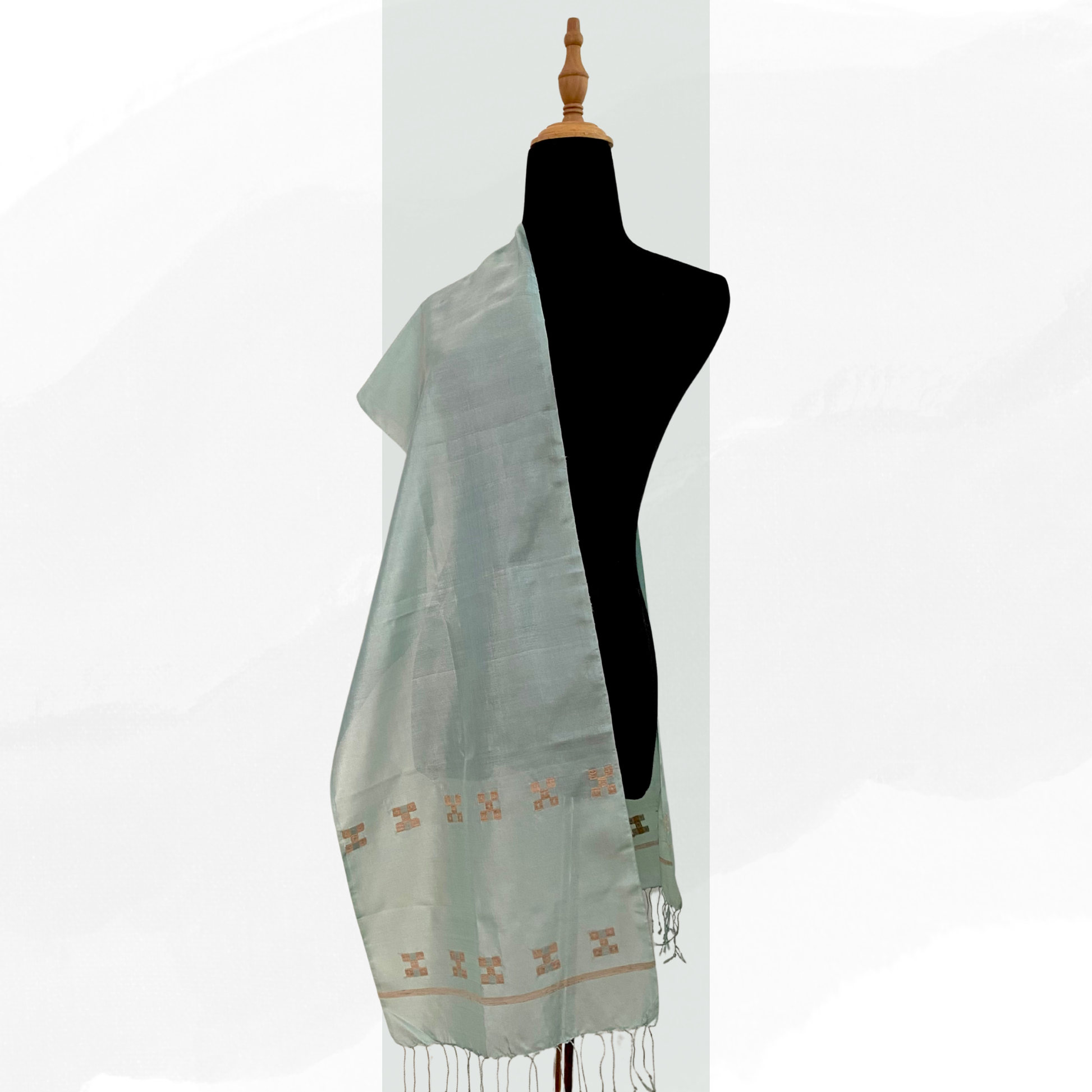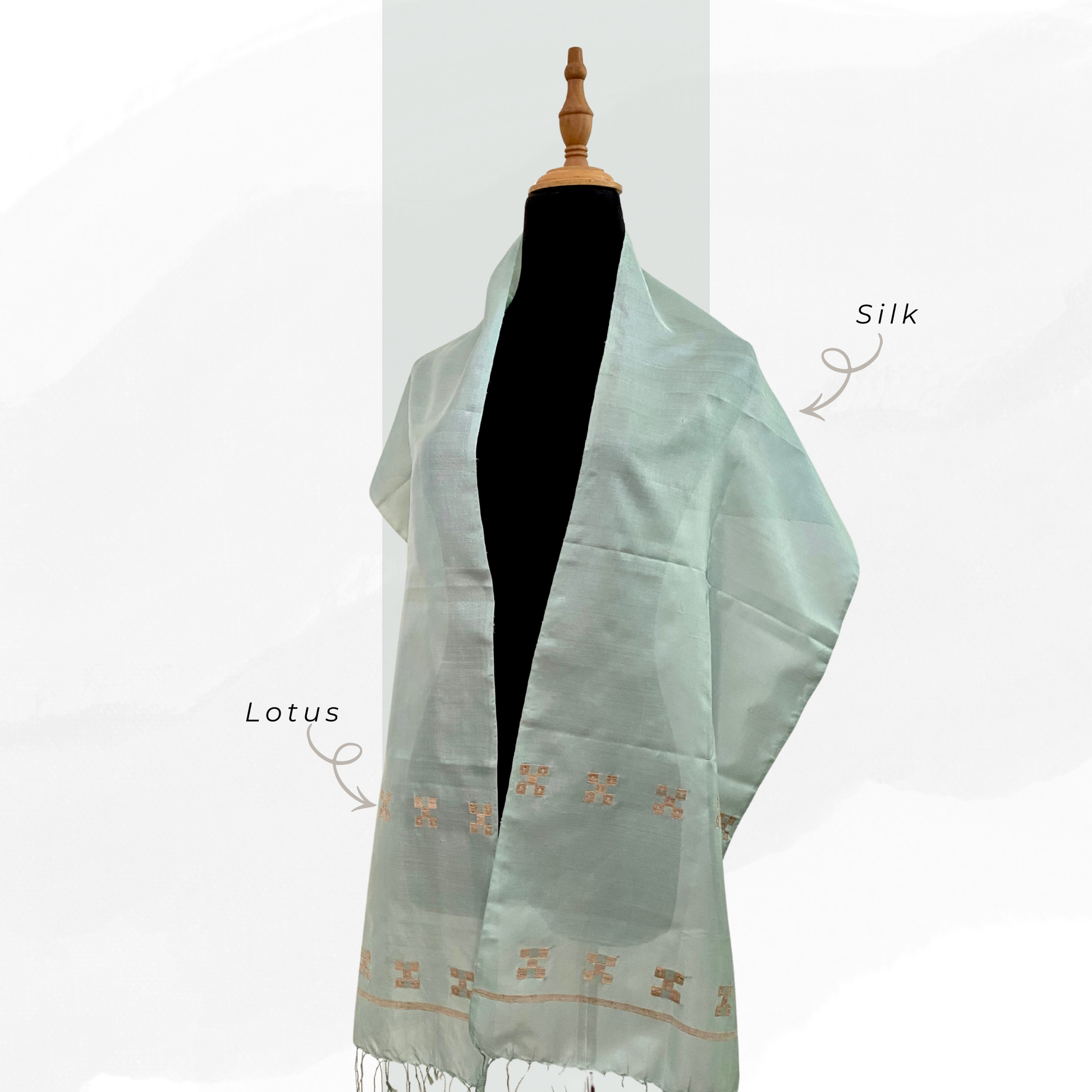 Inspired by nature, the Green Silk & Lotus Shawl symbolizes balance, renewal, and harmony. Handwoven with silk and lotus fiber, this color beautifully complements the Mon pattern and offers a fresh yet refined look suitable for all ages.